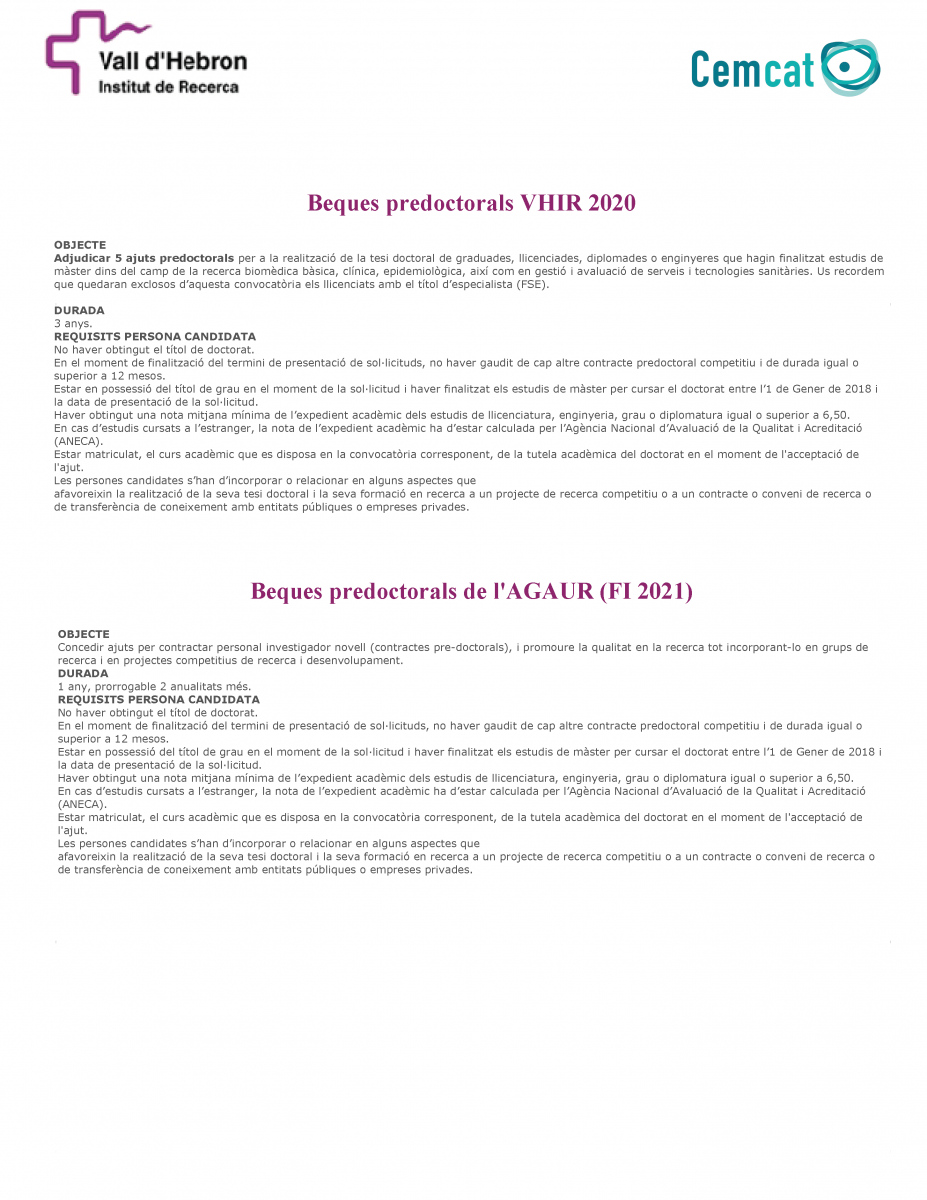 Cemcat is seeking researchers with an interest in the pathogenesis of MOG antibodies in patients with demyelination symptoms to apply for the AGAUR/VHIR predoc grants. Send your CV to <recursos.humans@cem-cat.org>.